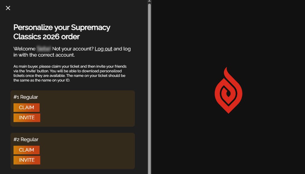 For the other tickets in your order (if applicable), choose ‘invite’. You will now see a personalization link. Copy the link and send it to the friend who will use this ticket. Advice him/her to create a Supremacy account first (see step 1) and click the personalization link after that.